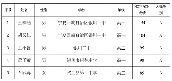 根据《CCFNOI2026名额分配方案》,宁夏参赛A类名额5人(A队由4名男生和1名女生组成)。现将NOI2026宁夏入选参赛名单公示如下: