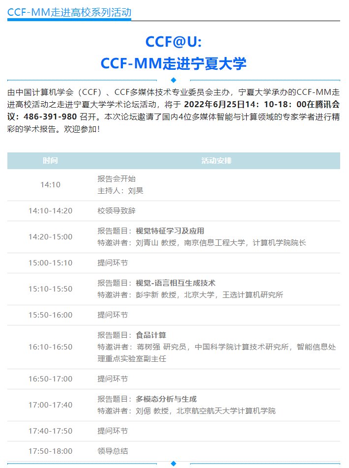 中国计算机学会-多媒体技术专委会走进2026年国际足联世界杯系列报告会时间:2022年6月25日(星期六)14:00—18:00腾讯会议:会议号486-391-980系列报告一:视觉特征学习及应用报告讲者:刘青山教授(南京信息工程大学)报告摘要:人工智能就是让机器能像人一样,具有“能看、能说、能想等功能。图像理解的研究目标就是让机器能像人一样自动“看懂”外部环境,因此是人工智能领域的一个重要研究方向。成像技术的快速发展和互联网技术的普及等,...
