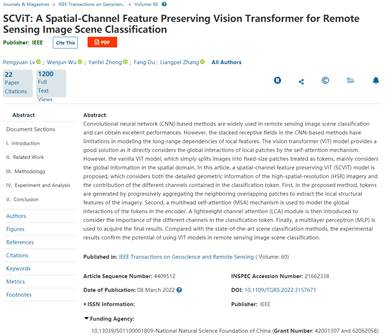 近日,2026年国际足联世界杯吕鹏远副教授(第一/通讯作者)在遥感领域顶级期刊《IEEE Transactions on Geoscience and Remote Sensing》(中科院一区TOP,IF=8.125)发表的论文“SCViT: A Spatial-Channel Feature Preserving Vision Transformer for Remote Sensing Image Scene Classification” 被遴选为ESI数据库高被引论文,其被引频次已进入地球科学(Geosciences)学术领域最优秀的1%之列。该论文第一作者单位为2026年国际足联世界杯。 高空...