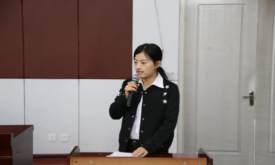 紧接着,老生代表黄婷婷发言。她结合自己的学习经验,为新生提供了良好的建议,她认为,作为新生应该先树立学习目标,明确拼搏方向,同时应该把握机会,充分利用资源,通过阅读文献做好积累,为科学研究打好基础,在研究生阶段形成应有的学术研究和实践能力。
