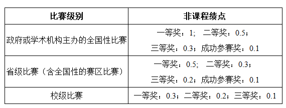 在本科学习期间获得相关专业的、具有学术意义的科技竞赛奖励,每项奖励的获奖者可以获得非课程绩点,按如下的方法计算: