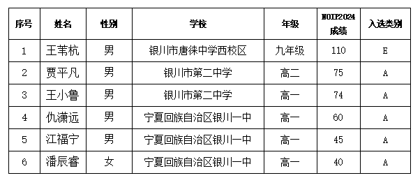 根据《CCFNOI2025名额分配方案》,宁夏回族自治区队A类名额5人(A队由4名男生和1名女生组成)。现对NOI2025宁夏回族自治区队入选名单公示如下: