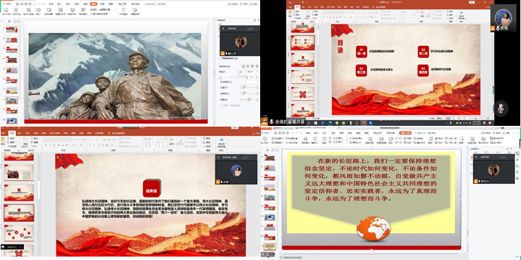 各班团支书从不同角度讲述了长征的过程以及意义等等。大家提到,长征是中国共产党用鲜血走出的一条信仰之路。纵横十余省,长驱半中国。新时代的我们要以革命先烈为榜样,不断发扬伟大的“长征精神”,走好新时代的长征路。而后,各班团支书讲述了革命先烈的真实事迹,一个个革命故事深入浅出、引人深思,同学们强烈的感受到革命先烈们不怕牺牲、勇往直前的民族精神。