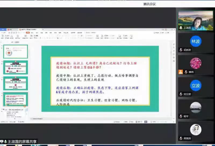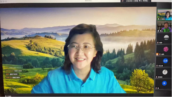 讲座伊始,王老师请老师们通过为自己心理状态打分的形式,测试了大家目前的心理健康程度,询问了老师们在疫情发生后的心路历程。之后,她详细的向大家介绍了危机的概念、人脑结构等相关专业知识,希望老师们在学会正确认识自己的心理状态的同时,学会调适和关照自我。她还从疫情初期、中期、后期及后疫情时代讲起,详细为老师们介绍了各个阶段的注意事项和与员工交流、沟通的技巧。讲座最后,王老师以视频的方式就本次讲座与在线老师进行了互动交流,在线老师们以聊天区对话和视频形式积极畅谈分享了此次讲座带来的感受和收获。讲座在轻松愉快的氛围中结束。